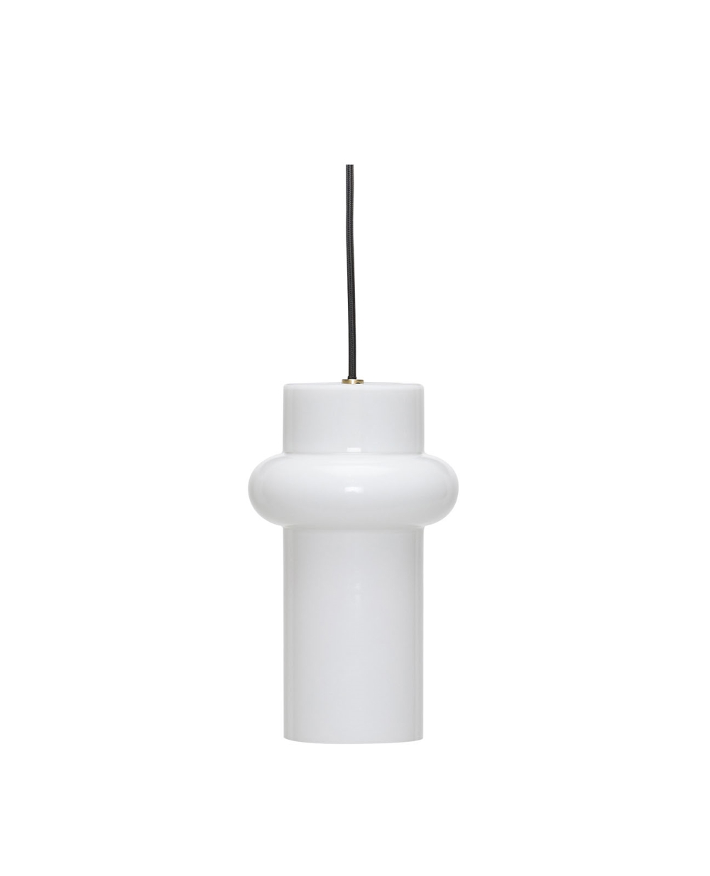 Pilule vereint einen klaren und zeitgemäßen Ausdruck mit Anspielungen auf die Formensprache der 80er Jahre. Der glänzend weiße Schirm aus mundgeblasenem Opalglas verbreitet ein angenehmes und gleichmäßiges Licht, während feine Details aus Messing und das schwarze Stoffkabel der Lampe Charakter und Kontrast verleihen.