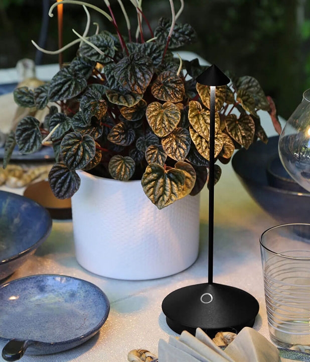 Die Akkulampe Pina hat ein stilvolles Design mit einem dezenten Lampenschirm auf einem schlanken Lampenstiel mit solider Basis. Die tragbare Tischlampe ist leicht mitzunehmen und kann in der Helligkeit gedimmt werden, um das Licht an die gewünschte Stimmung anzupassen, über eine Touch-Funktion an der Basis. Hier wird auch die Farbtemperatur von entweder 2200K, 2700K oder 3000K gewählt. Die Einstellung der Farbtemperatur kann durch eine Speicherfunktion gespeichert werden.