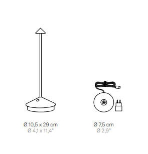 Pina ist aus Druckguss-Aluminium gefertigt und in verschiedenen Ausführungen erhältlich, von denen die meisten sowohl für den Innen- als auch Außenbereich geeignet sind. Die Varianten in Antikgold, Silber und Kupfer werden nicht für den dauerhaften Außeneinsatz empfohlen. Alle Varianten müssen im Innenbereich aufgeladen werden.