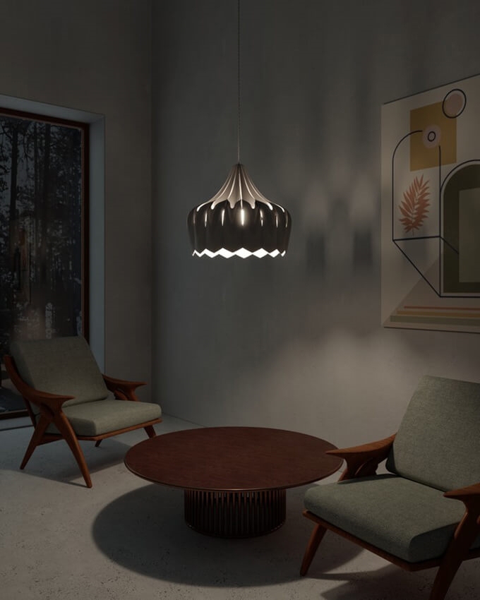 Pioni ist eine schöne Pendelleuchte, die mit ihrem blumenförmigen Schirm eine sanfte Atmosphäre für jedes Zuhause schafft. Das Licht scheint sanft durch die kleinen Löcher im Schirm, was einen angenehmen und ruhigen Effekt erzeugt.