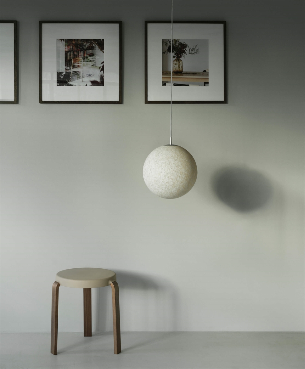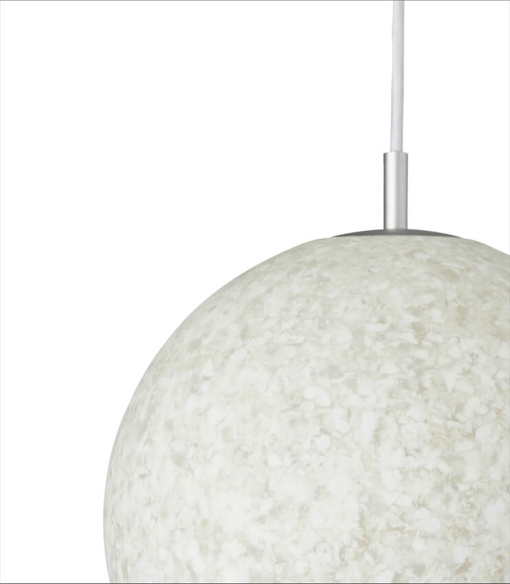 Pix ist eine Kollektion von Pendelleuchten in archetypischer sphärischer Form und einer kreisförmigen Zusammensetzung aus 100% recyceltem Plastikmüll.