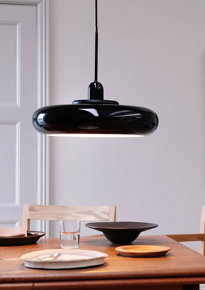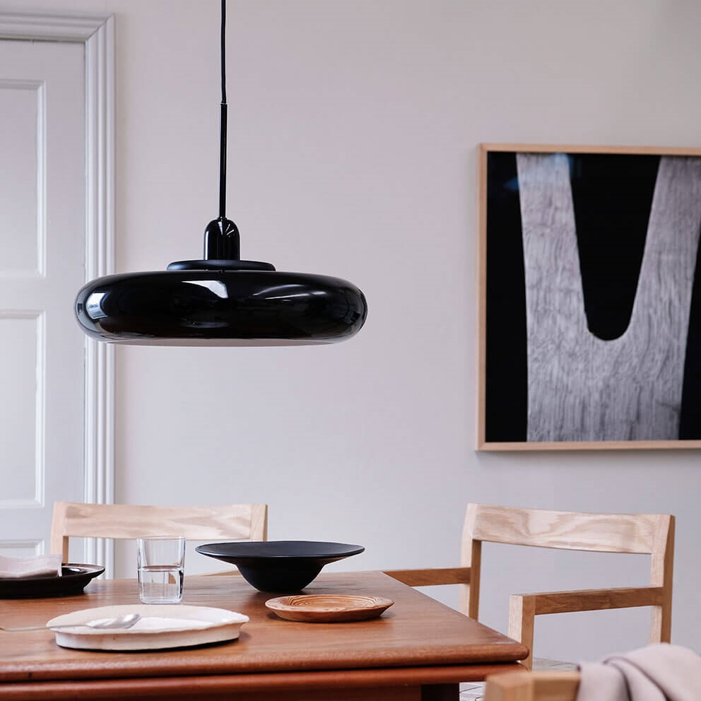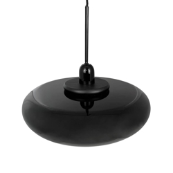 Dyberg Larsen Planet Pendelleuchte, schwarz mit schwarzem Holzring - entworfen von Frank Kerdil