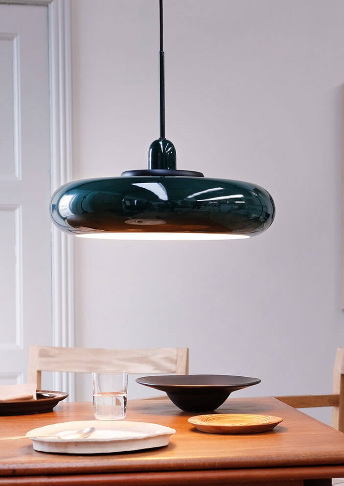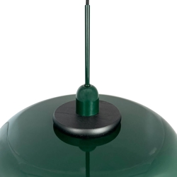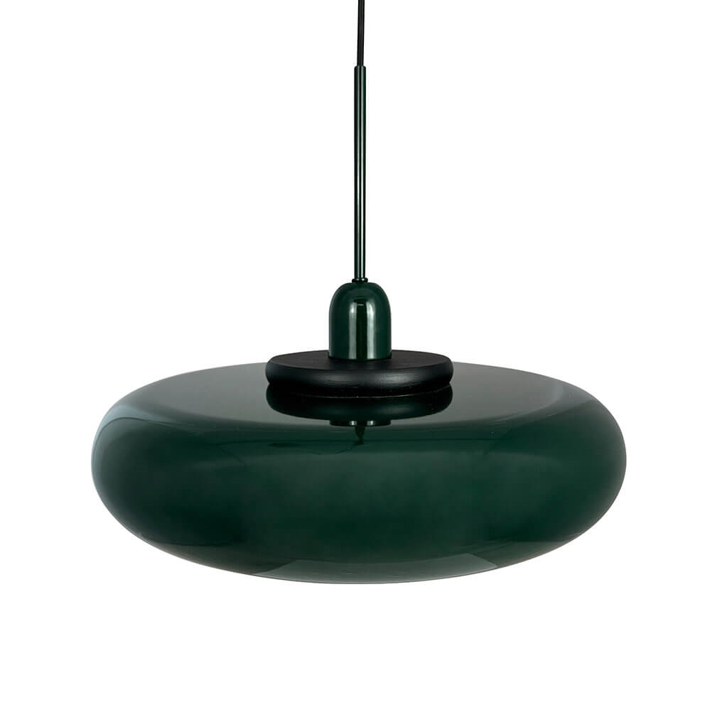 Dyberg Larsen Planet Pendelleuchte, dunkelgrün mit schwarzem Holzring - entworfen von Frank Kerdil