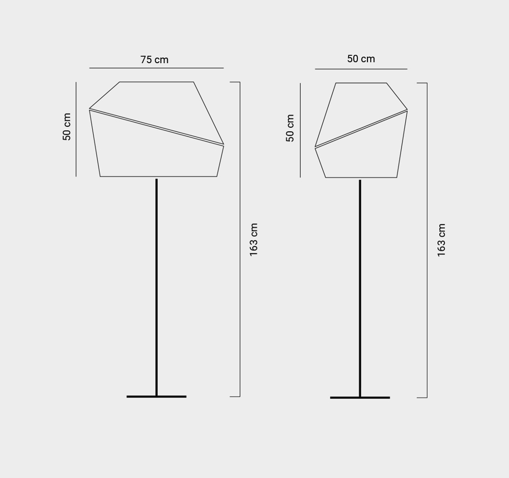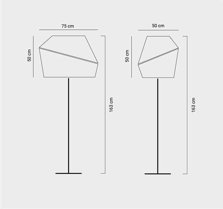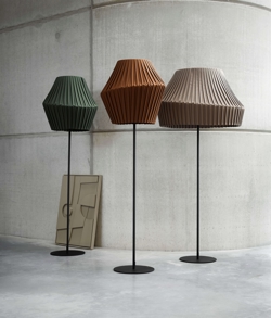Die Lampe ist sowohl als Stehlampe als auch als Pendelleuchte mit Schirmen in zwei verschiedenen Größen und fünf verschiedenen Farben erhältlich - Off White, Anthrazit, Deep Green/Grün, Sand Taupe und Cinnamon Brown/Braun.