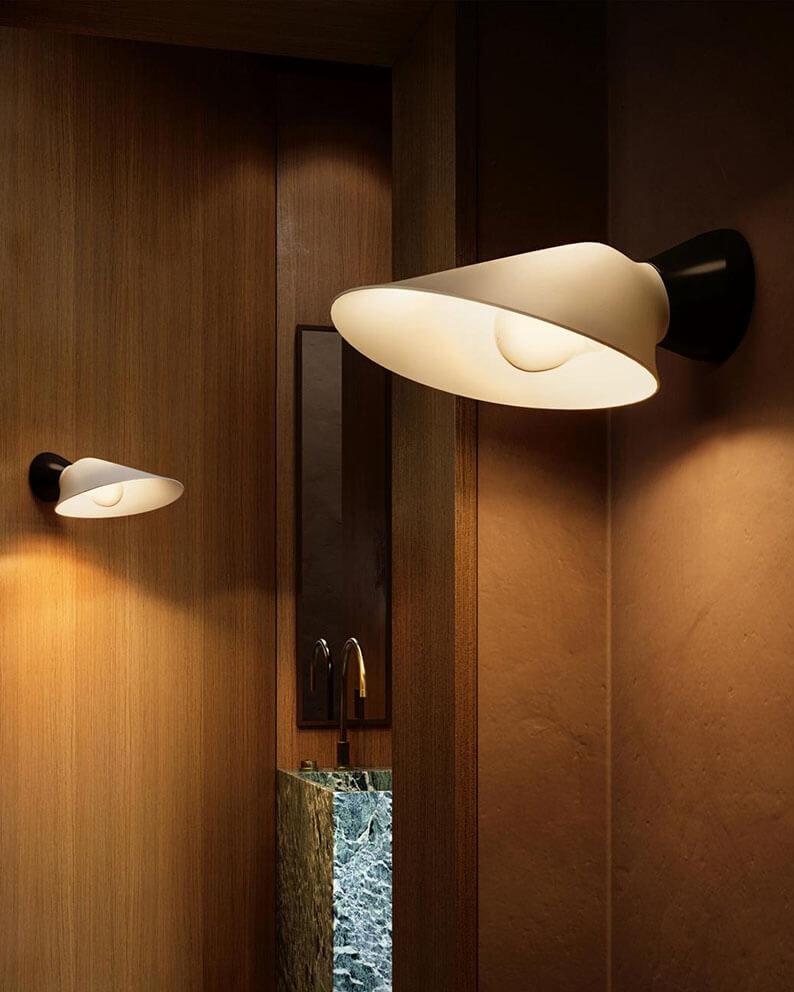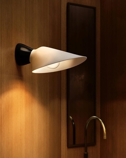 Plume Bath Wandleuchte hat ein zartes Design mit weichen Linien. Der Lampenschirm lenkt das Licht nach unten und erhellt gleichzeitig den Raum.