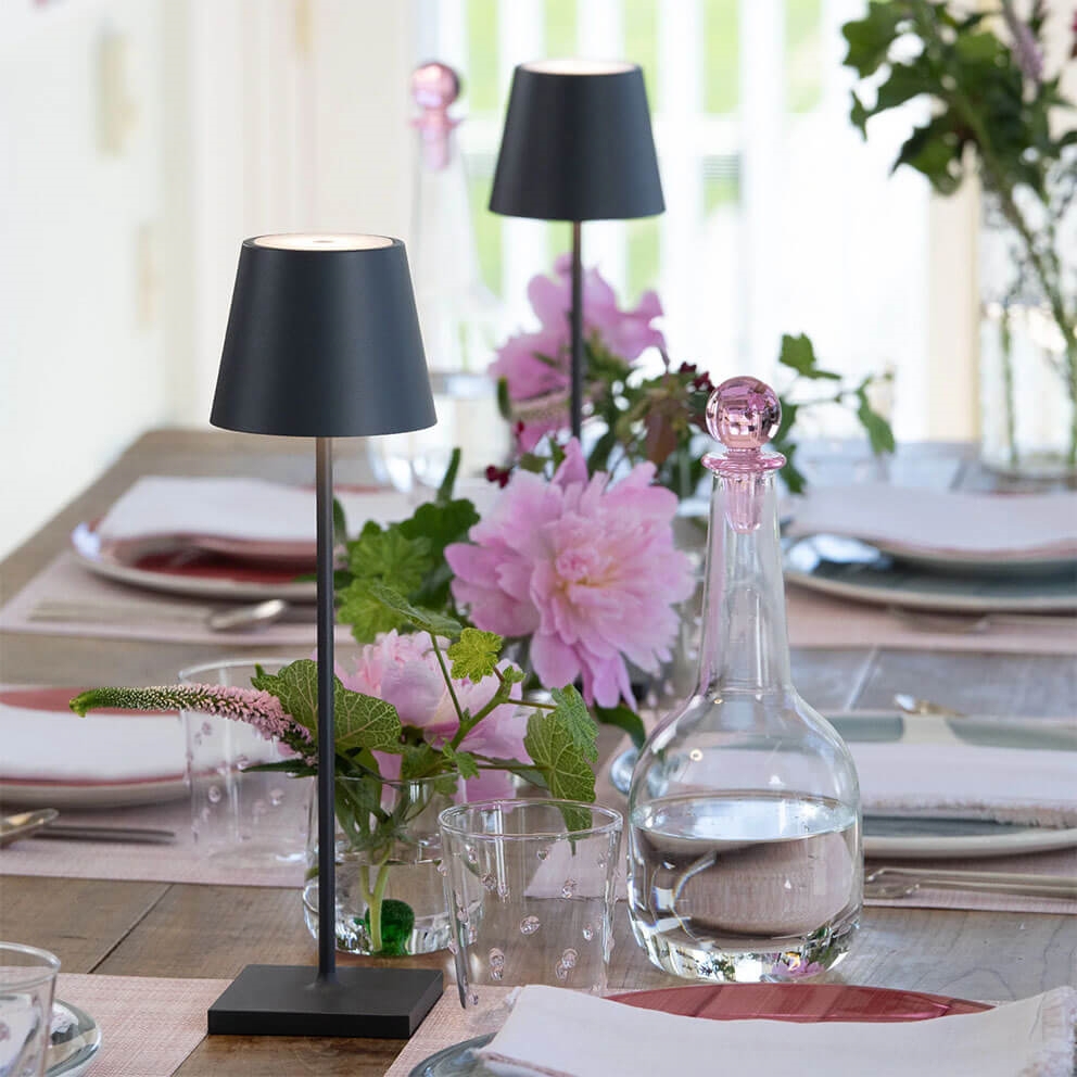 Die tragbare Tischleuchte Poldina besticht durch ihr stilvolles Design mit einem klassischen Lampenschirm auf einem schlanken Lampenstiel mit dezenter Basis. Die Lampe ist auch in den kleineren Ausführungen Mini und Micro erhältlich.
