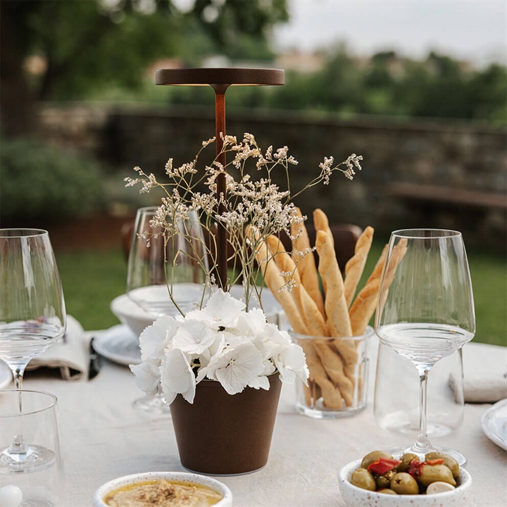 Die Tischlampe ist leicht mitzunehmen und kann dank ihrer IP54-Klassifizierung sowohl drinnen als auch draußen verwendet werden. Die Lampe kann mit einer Touch-Funktion an der Unterseite des Schirms gedimmt werden, um das Licht an die gewünschte Stimmung anzupassen. Die Farbtemperatur von entweder 2200K, 2700K oder 3000K wird ebenfalls mit der Touch-Funktion gewählt und kann von einer Speicherfunktion gespeichert werden.
