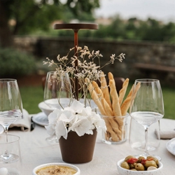 Die tragbare Tischlampe Poldina Reverso hat ein unkonventionelles Design, bei dem die klassische Tischlampe auf den Kopf gestellt wird. Dies wird genutzt, um die Akkulampe mit einem multifunktionalen und lebensmittelsicheren Behälter aus Thermoplast (PET) auszustatten, der als Blumenvase oder Bonbonschale verwendet werden kann.