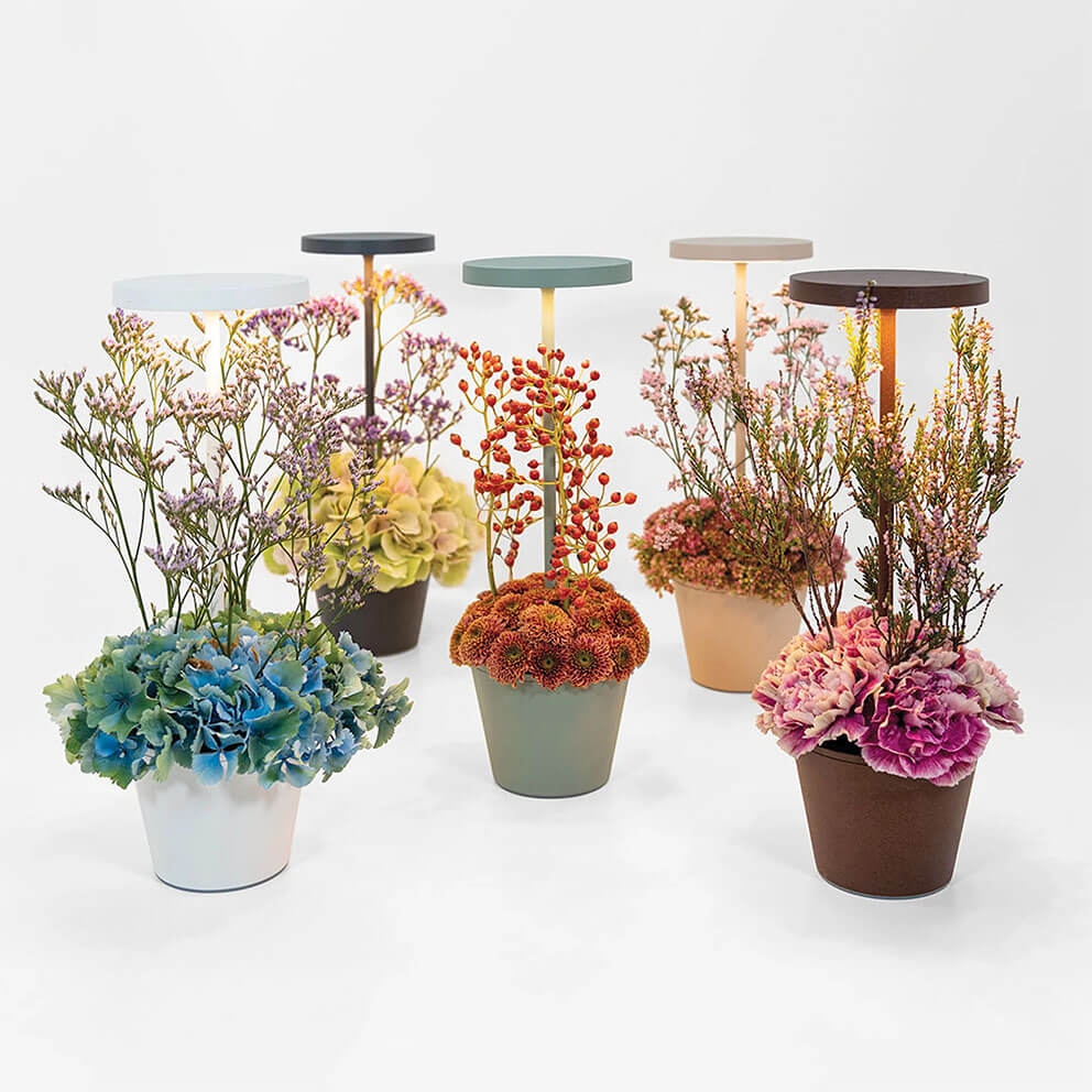Die tragbare Tischlampe Poldina Reverso hat ein unkonventionelles Design, bei dem die klassische Tischlampe auf den Kopf gestellt wird. Dies wird genutzt, um die Akkulampe mit einem multifunktionalen und lebensmittelsicheren Behälter aus Thermoplast (PET) auszustatten, der als Blumenvase oder Bonbonschale verwendet werden kann.