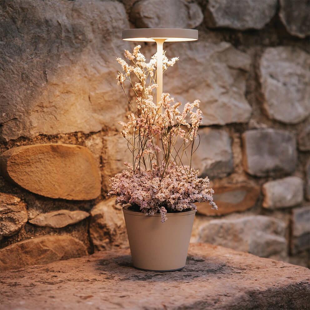 Die Tischlampe ist leicht mitzunehmen und kann dank ihrer IP54-Klassifizierung sowohl drinnen als auch draußen verwendet werden. Die Lampe kann mit einer Touch-Funktion an der Unterseite des Schirms gedimmt werden, um das Licht an die gewünschte Stimmung anzupassen. Die Farbtemperatur von entweder 2200K, 2700K oder 3000K wird ebenfalls mit der Touch-Funktion gewählt und kann von einer Speicherfunktion gespeichert werden.