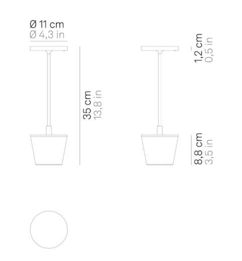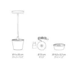 Poldina Reverso ist aus druckgegossenem Aluminium gefertigt und in mehreren Farben erhältlich. Die wiederaufladbare Tischlampe kann bis zu 12 Stunden bei voller Leistung leuchten und wird auf der mitgelieferten Ladestation aufgeladen. Eine vollständige Aufladung dauert 6-7 Stunden und muss drinnen erfolgen.