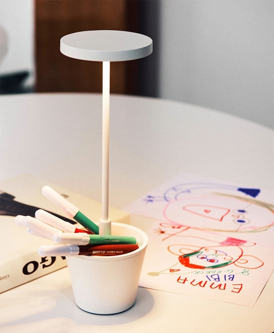 Die tragbare Tischleuchte Poldina Reverso hat ein unkonventionelles Design, bei dem die klassische Tischleuchte auf den Kopf gestellt wird. Dies wird genutzt, um die Akkuleuchte mit einem multifunktionalen und lebensmittelsicheren Behälter aus Thermoplast (PET) auszustatten, der als Blumenvase oder Bonbonschale verwendet werden kann.