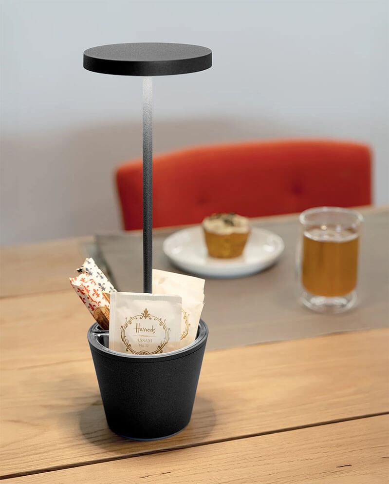 Die tragbare Tischlampe Poldina Reverso hat ein unkonventionelles Design, bei dem die klassische Tischlampe auf den Kopf gestellt wird. Dies wird genutzt, um die Akkulampe mit einem multifunktionalen und lebensmittelsicheren Behälter aus Thermoplast (PET) auszustatten, der als Blumenvase oder Bonbonschale verwendet werden kann.