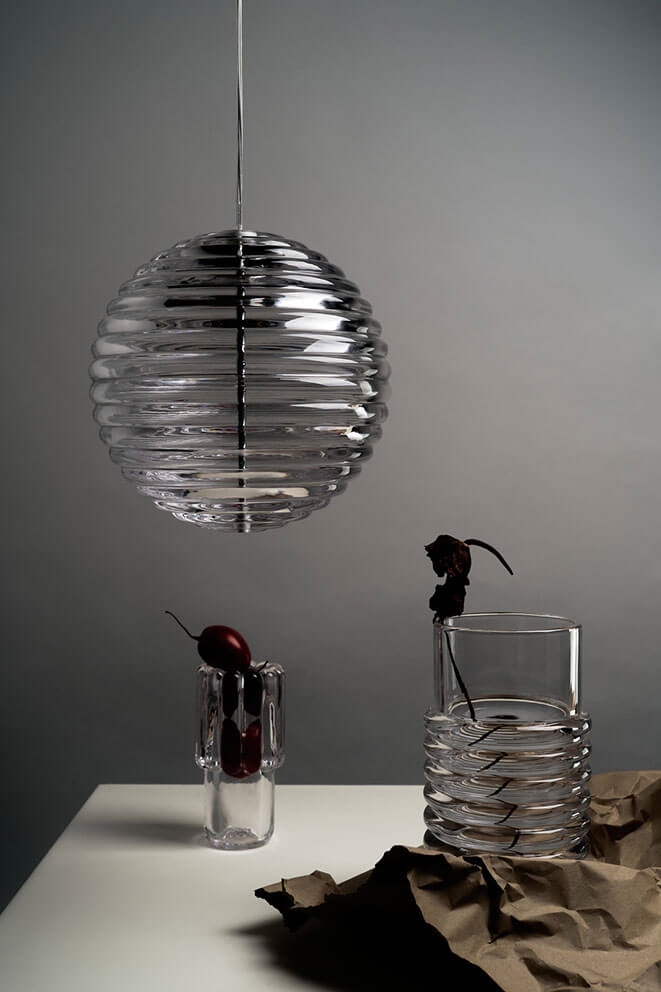 Press die Pendelleuchte Sphere ist aus dickem Pressglas gefertigt und für die Ewigkeit entworfen. Das gerippte Glas bricht und streut das Licht in linearen und gestreiften Mustern und macht die Pendelleuchte zu einer eleganten Ergänzung der Einrichtung. Hängen Sie die Pendelleuchte einzeln oder in Gruppen über den Esstisch oder Küchentisch.