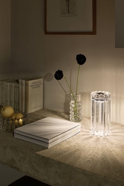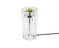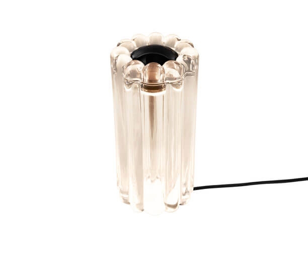 Die Tischleuchte Press ist aus dickem Pressglas gefertigt und für die Ewigkeit gemacht. Das gerippte Glas bricht und streut das Licht in linearen und gestreiften Mustern und macht die Tischleuchte zu einer kleinen Lichtskulptur. Die Metallkuppel der Press Tischleuchte kann ausgetauscht werden, und es sind Kuppeln in Silber, Gold und Schwarz enthalten.