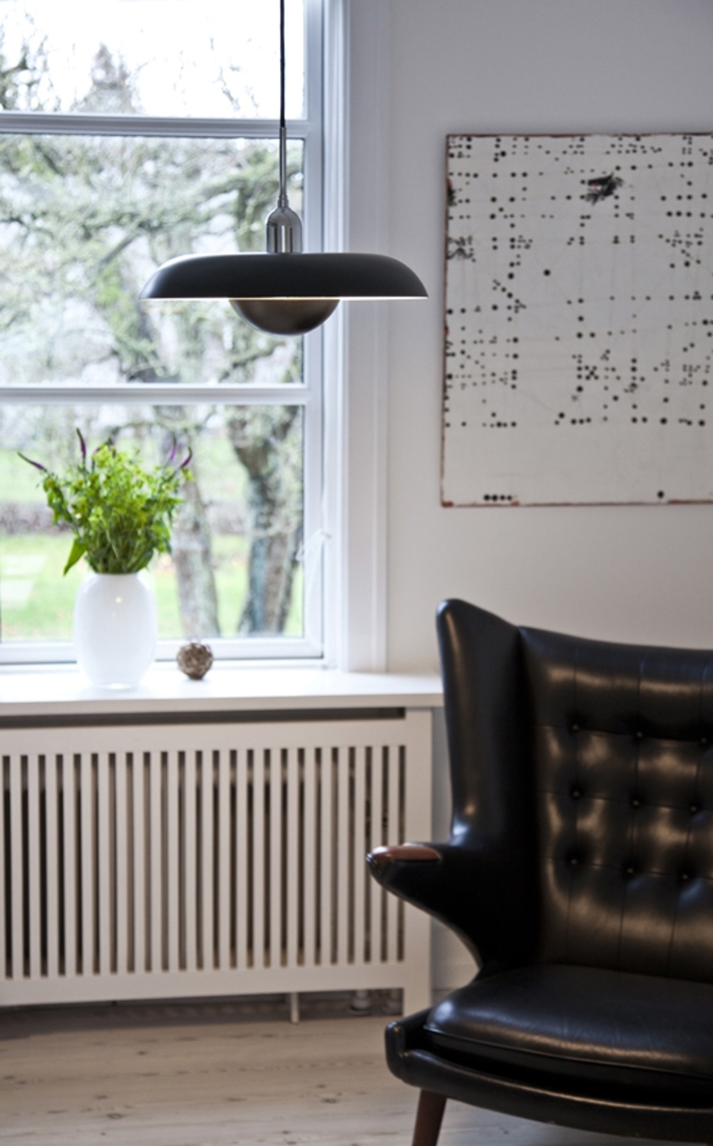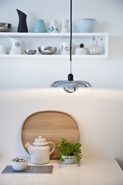 RA ist in zwei Größen als Pendel- und Tischleuchte in Weiß, Schwarz und Chrom erhältlich.