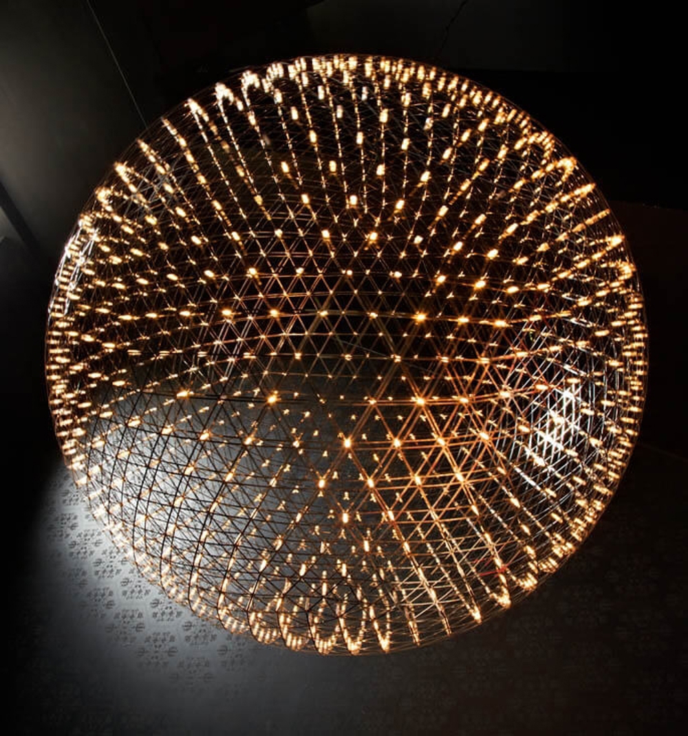 Moooi Pendelleuchte ist eine elegante Kugel, konstruiert aus filigranen Metallbändern, die den Strom zu den vielen LED-Leuchtmitteln leiten, die an allen Verbindungsstellen der Metallbänder platziert sind. Die hunderten von Lichtquellen machen die Leuchte zu einer wunderschönen, glitzernden Lichtkugel, dennoch ist das Licht der Leuchte fein und weich und wird einen Raum nicht dominieren.
