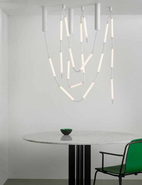 Reb Lampe 8 ist ein unkonventionelles Pendelleuchte, das aus acht LED-Modulen besteht, die mit einem weißen Mesh-Schlauch aus PET überzogen sind. Die Lampe hängt wie ein beleuchtetes Seil von der Decke und ist flexibel, sodass sie allein oder in Gruppen kreativ als skulpturales Element im Raum arrangiert oder nebeneinander gehängt als Raumteiler oder Lichtvorhang fungieren kann.