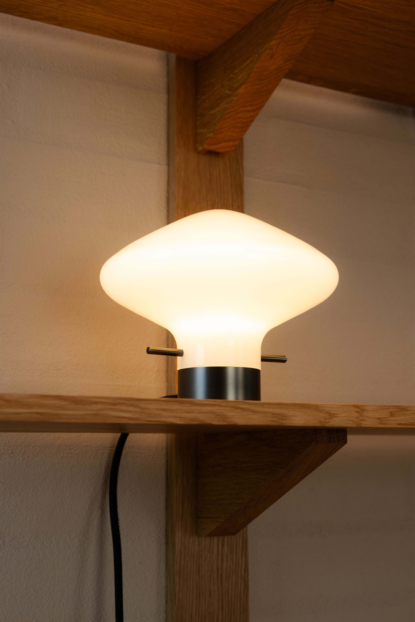 Die Tischlampe Repose aus glänzendem mundgeblasenem Opalglas besticht durch ihr leichtes Design, bei dem ein charakteristischer schwarzer Metallstab den Schirm hält. Der Metallstab ist inspiriert von traditionellen japanischen Haarnadeln, die trotz ihrer einfachen Form eine hohe Funktionalität aufweisen.