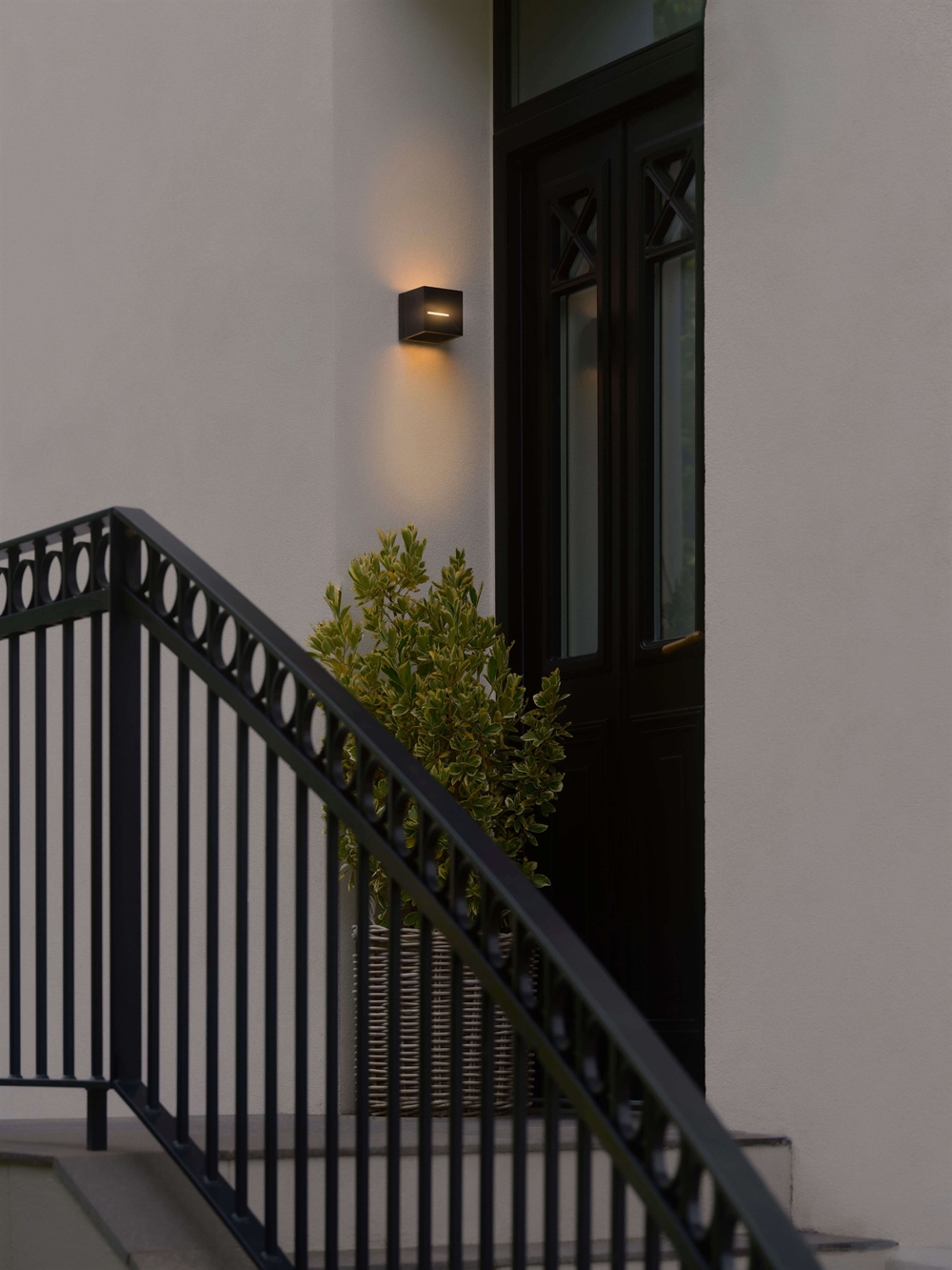 Die quadratische Außenwandleuchte Rivo hat ein minimalistisches Design und eine integrierte LED-Lichtquelle. Das schöne indirekte Licht strahlt sowohl nach oben als auch nach unten sowie durch die Front der Wandleuchte, was sie zu einer idealen Wahl für viele Eingangsbereiche macht.