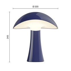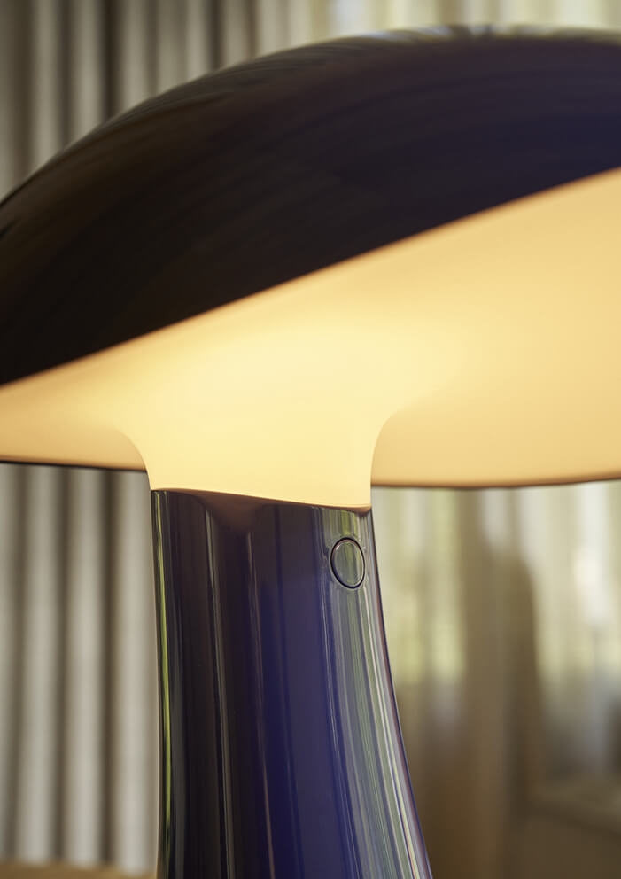 Die batteriebetriebene Lampe Rumee in Blau hat ein modernes und funktionales Design mit einer weichen skulpturalen Form, inspiriert von den geschwungenen Kurven eines geräumigen und breiten Hutes. Der Name spielt auf den Klang von Roomie an – dem informellen Ausdruck für einen Mitbewohner – und vermittelt ein Gefühl von Heimeligkeit, Wärme und Geborgenheit.