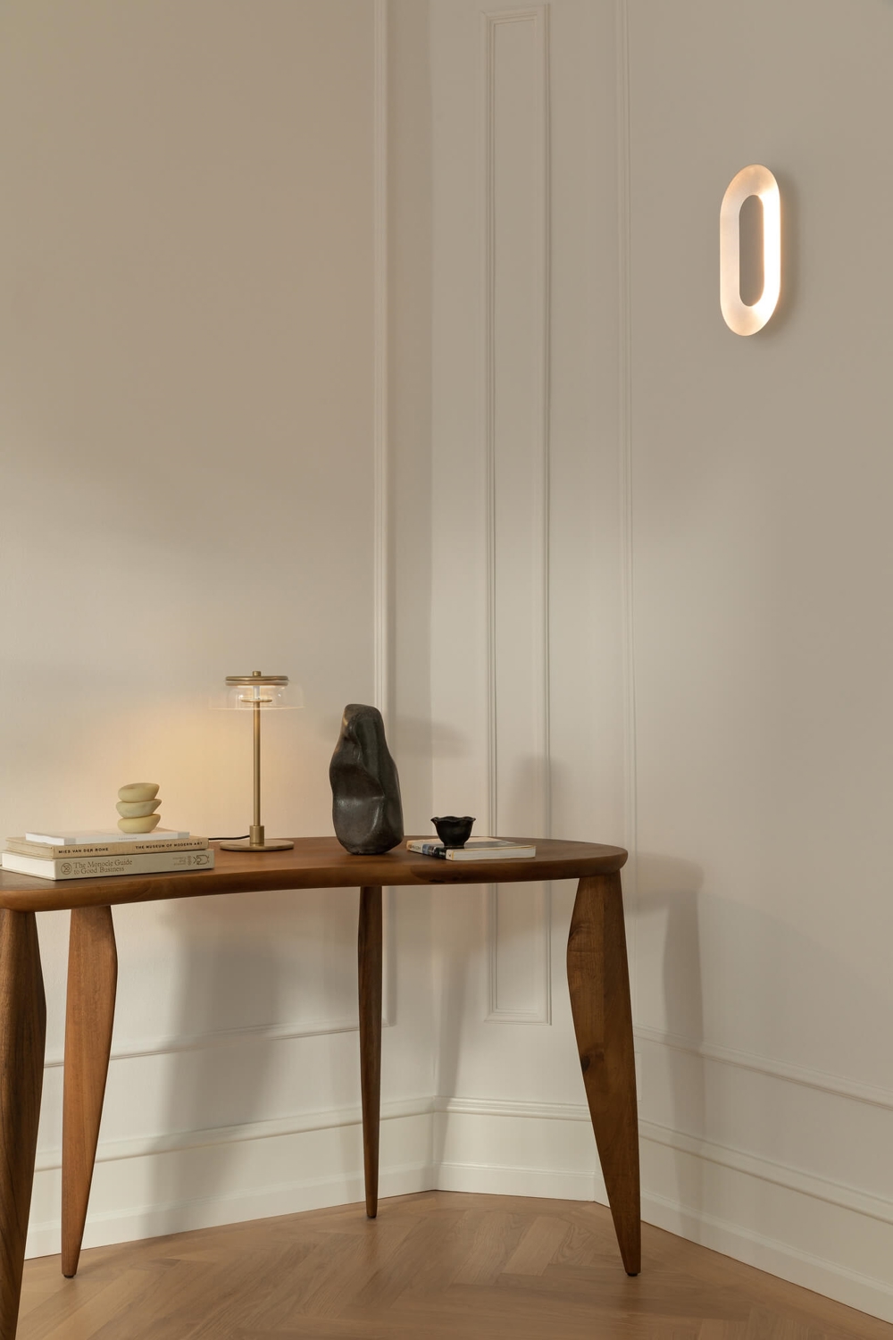 Die Sasi Small Wandleuchte schafft mit ihrer weichen Formgebung, einer harmonischen Farbpalette und sorgfältig ausgewählten Materialien eine schöne Dekoration. Sasi besteht aus einem ovalen Aluminiumschirm in gebürstetem Silber, der die Basis bildet - und eine kleinere Form aus hochglanzpoliertem Messing ist in der Mitte der Lampe platziert. Der glänzende Schirm bedeckt das integrierte LED-Modul, das ein dekoratives Licht verbreitet und reflektiert. Die Sasi Wandleuchte ist sowohl ein- als auch ausgeschaltet schön.