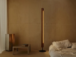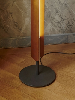 Die Stehlampe Seki-Han hat ein skulpturales Design mit zwei vertikalen Blättern aus Eschenholz, die durch verchromte Metallbeschläge verbunden und auf einer schwarzen Eisenbasis montiert sind. Die Holzblätter können um die röhrenförmige Lichtquelle der Lampe rotieren und so die Lichtverteilung variieren. Der integrierte Dimmer ermöglicht es, das Licht an jede Stimmung anzupassen.