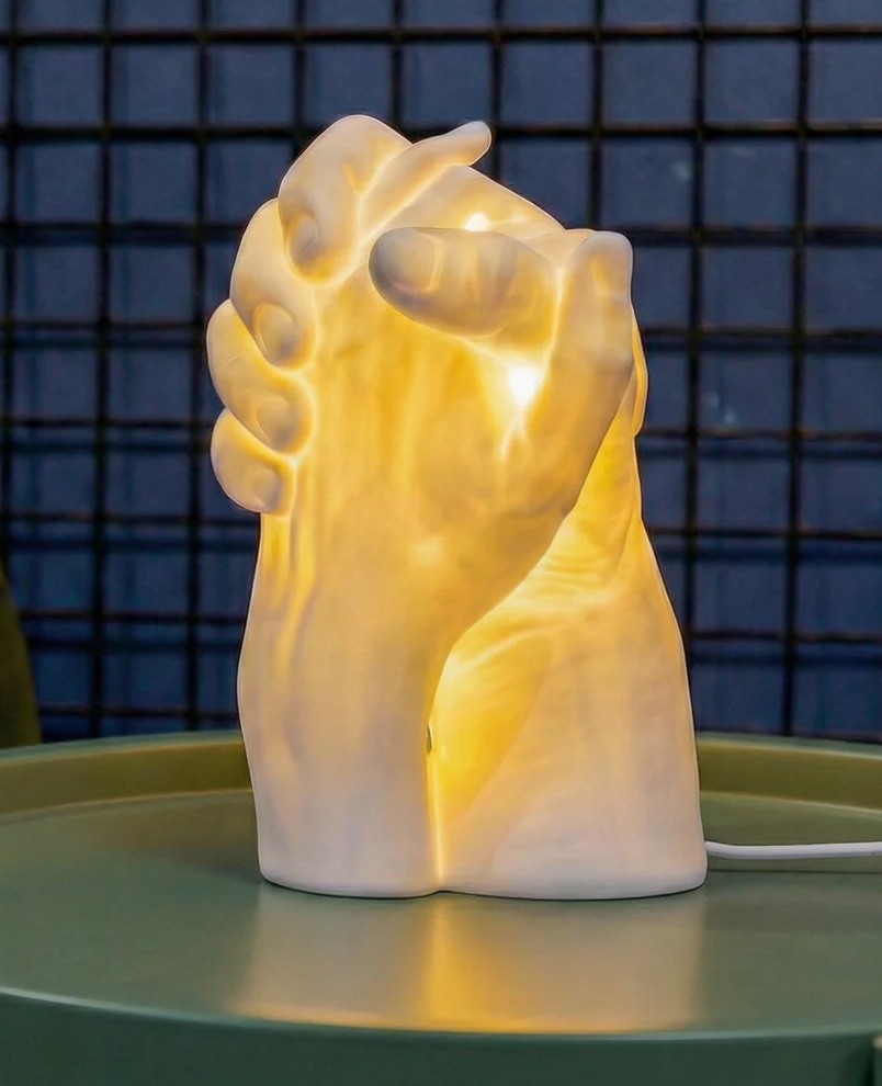 Mit unseren Händen können wir berühren, erschaffen, spielen, bauen und ausdrücken, wer wir sind – ganz ohne Worte. Diese beiden Hände symbolisieren ein starkes Band der Verbundenheit und reine Liebe; das Licht, das entsteht, wenn wir zusammen sind. Ein poetisches und emotionales Design, in dem Form und Funktion verschmelzen und eine stimmungsvolle Lampe mit Wärme und Tiefe schaffen.