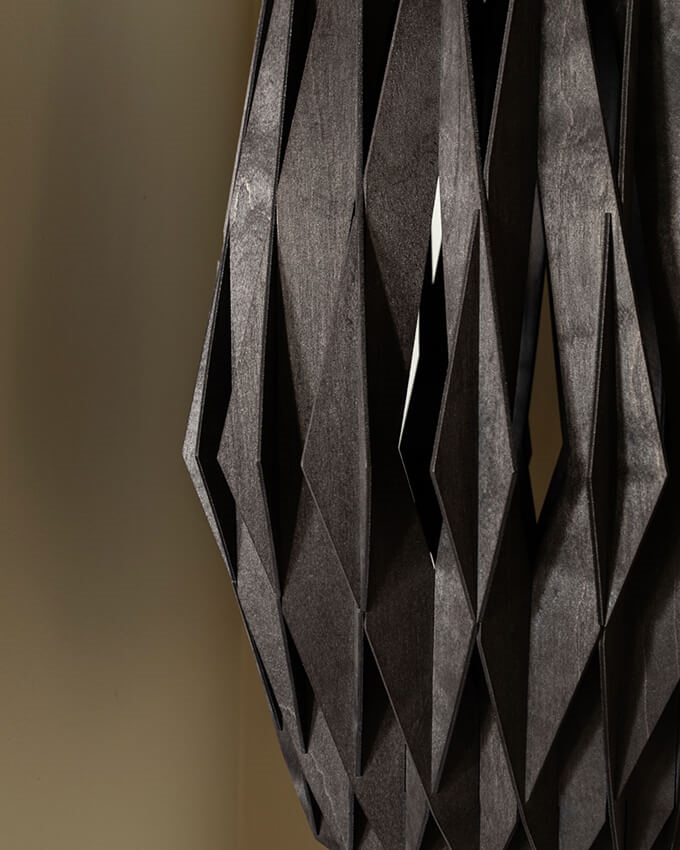 Die Pendelleuchte hat mit ihrer großen Form eine Präsenz im Raum und passt sowohl in private als auch in öffentliche Umgebungen. Die Leuchte besteht aus nachhaltig zertifiziertem Birkenfurnier, das handgefertigt ist. Die Birkenlamellen erzeugen eine Wärme, wenn das Licht hindurchscheint, und sind ohne Schrauben oder Kleber zusammengefügt. Darüber hinaus hat die Pendelleuchte ein stilvolles und geometrisches Design, das in jedem Raum zum Blickfang wird.