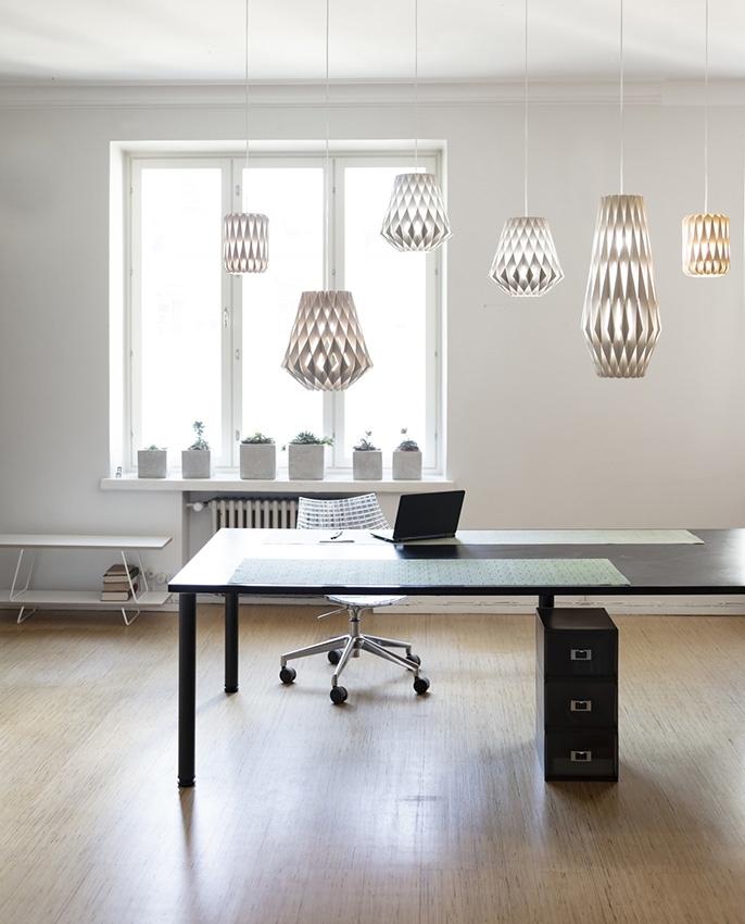 Die gesamte Signature-Serie besteht aus auffälligen Pendelleuchten, die mit ihren Schirmen ein einzigartiges Schattenspiel durch die Struktur erzeugen. Die Signature-Serie ist in einer Reihe von Modellen und verschiedenen Größen in den Farben Birke, Weiß und Schwarz erhältlich.