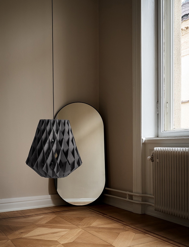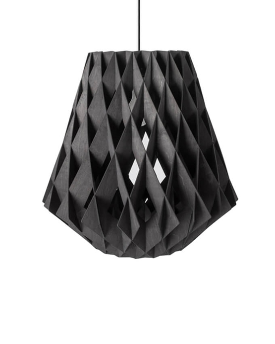 Die Pendelleuchte hat mit ihrer großen Form eine Präsenz im Raum und passt sowohl in private als auch öffentliche Umgebungen. Die Leuchte besteht aus nachhaltig zertifiziertem Birkenfurnier, das handgefertigt ist. Die Birkenlamellen erzeugen eine Wärme, wenn das Licht hindurchscheint, und sind ohne Schrauben oder Kleber zusammengefügt.