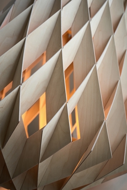 Die Pendelleuchte hat mit ihrer großen Form eine Präsenz im Raum und passt sowohl in private als auch in öffentliche Umgebungen. Die Leuchte besteht aus nachhaltig zertifiziertem Birkenfurnier, das handgefertigt ist. Die Birkenlamellen erzeugen eine Wärme, wenn das Licht hindurchscheint, und sind ohne Schrauben oder Klebstoff zusammengefügt.