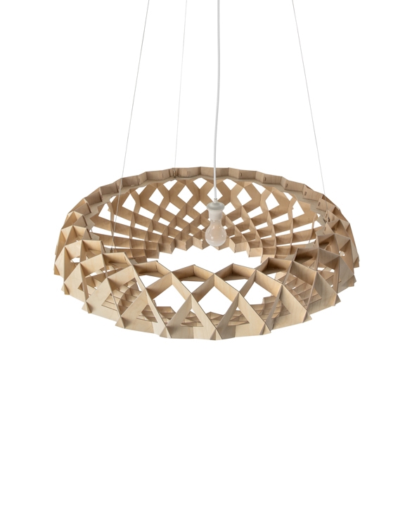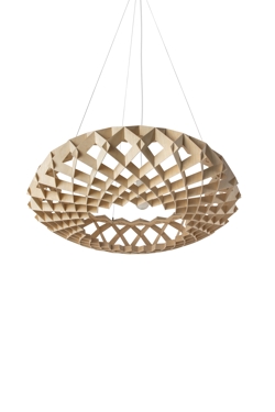 Die Pendelleuchte hat mit ihrer großen Form eine Präsenz im Raum und passt sowohl in private als auch in öffentliche Umgebungen. Die Leuchte besteht aus nachhaltig zertifiziertem Birkenfurnier, das handgefertigt ist. Die Birkenlamellen erzeugen eine Wärme, wenn das Licht hindurchscheint, und sind ohne Schrauben oder Klebstoff zusammengefügt.