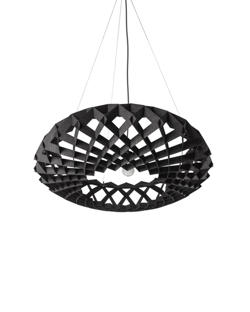 Die Pendelleuchte hat mit ihrer großen Form eine Präsenz im Raum und passt sowohl in private als auch in öffentliche Umgebungen. Die Leuchte besteht aus nachhaltig zertifiziertem Birkenfurnier, das handgefertigt ist und ohne Schrauben oder Kleber montiert wird.