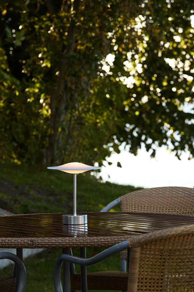 Die tragbare Tischlampe Sinus Portable kann sowohl drinnen als auch draußen verwendet werden und ist perfekt für den Esstisch, gemütliche Stunden im Wohnzimmer oder Sommerabende auf der Terrasse. Sie ist in drei Stufen über eine Touch-Funktion an der Oberseite dimmbar und liefert ein weiches und angenehmes blendfreies Licht. Bei voller Leistung leuchtet die Batterielampe bis zu 10 Stunden, bei 40% Helligkeit bis zu 24 Stunden und bei 10% bis zu 86 Stunden.
