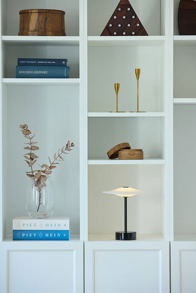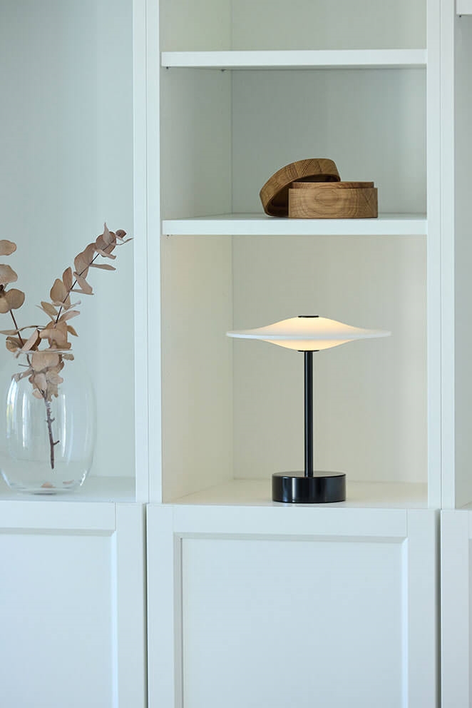 Die Lampenserie Sinus ist von der Sinuskurve inspiriert, die eine harmonische mathematische Form hat. Die ursprüngliche Sinus Pendelleuchte wurde 1967 geschaffen, und das elegante Design verkörpert den bekannten klaren skandinavischen Ausdruck dieser Zeit. Mit der Tischlampe Sinus Portable in schwarzer Ausführung, die 2025 eingeführt wurde, ist eine schöne wiederaufladbare Tischlampe basierend auf dem ursprünglichen raffinierten Design entstanden.