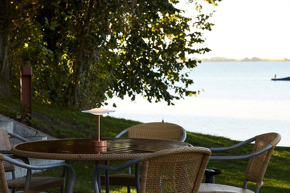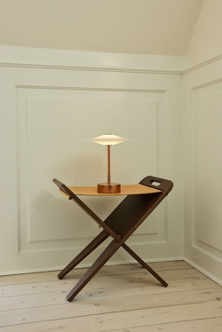 Die Lampenserie Sinus ist von der Sinuskurve inspiriert, die eine harmonische mathematische Form hat. Die ursprüngliche Sinus Pendelleuchte wurde 1967 geschaffen, und das elegante Design verkörpert den bekannten klaren skandinavischen Ausdruck dieser Zeit. Mit der Tischlampe Sinus Portable mit Kupferfinish, die 2025 eingeführt wurde, ist eine schöne wiederaufladbare Tischlampe entstanden, die auf dem ursprünglichen raffinierten Design basiert.