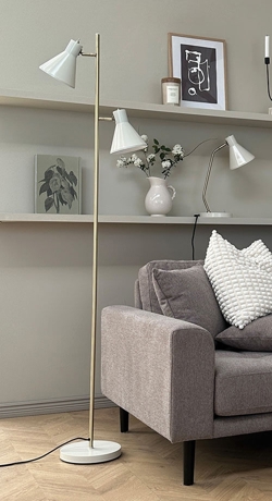 Die Sleep Stehlampe hat ein minimalistisches Design und kann mit ihren zwei Lichtquellen unter anderem als Leselicht im Wohnzimmer oder zur Beleuchtung eines größeren Bereichs im Zuhause verwendet werden. Die zwei eleganten Schirme können gekippt und gedreht werden, sodass Sie die Lichtausrichtung selbst bestimmen können. Die Lichtquellen werden mit Schaltern an den Schirmen ein- und ausgeschaltet, die an der Messingstange montiert sind.