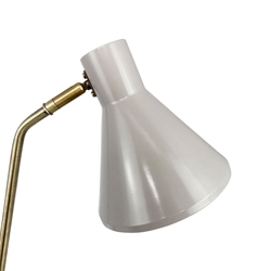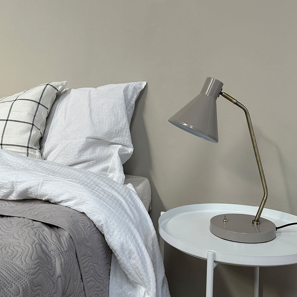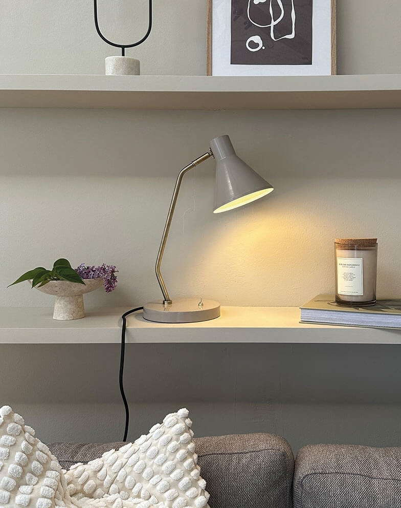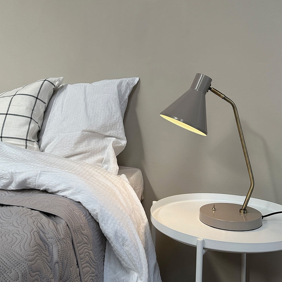 Die Sleep Tischlampe hat ein minimalistisches Design und eignet sich perfekt als Lampe auf dem Nachttisch im Schlafzimmer, dem Schreibtisch im Büro oder einem Regal im Wohnzimmer. Die Tischlampe strahlt schlichte Eleganz aus mit einem Knick im Messingstab und einem neigbaren Schirm. Die Lampe wird mit einem Schalter an der Basis ein- und ausgeschaltet.