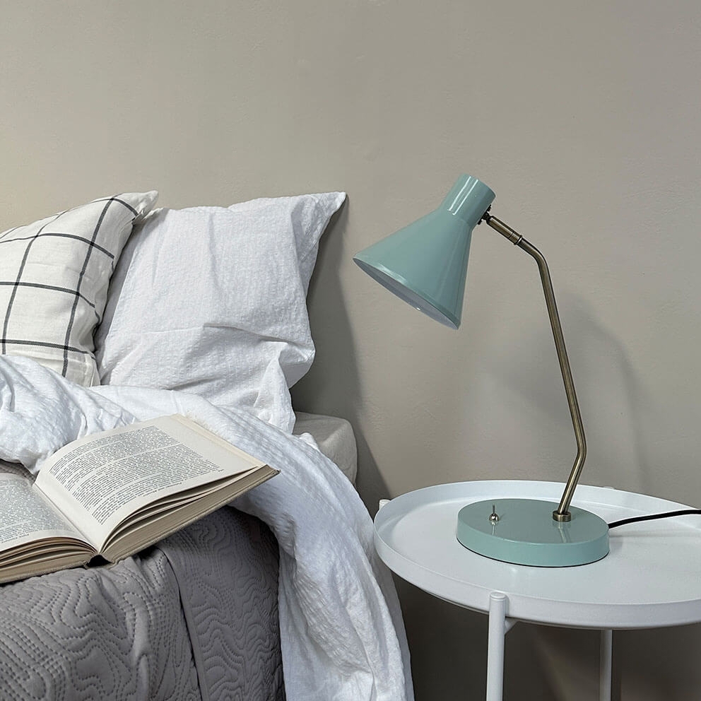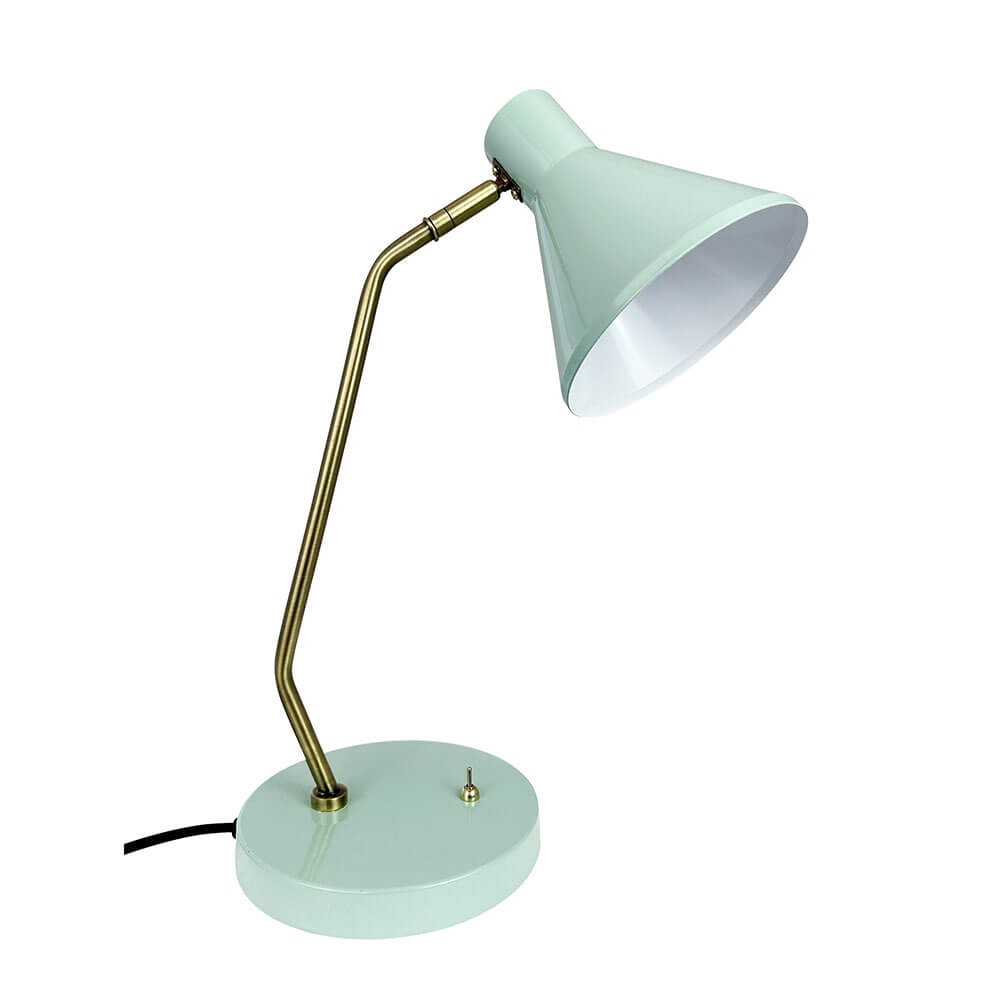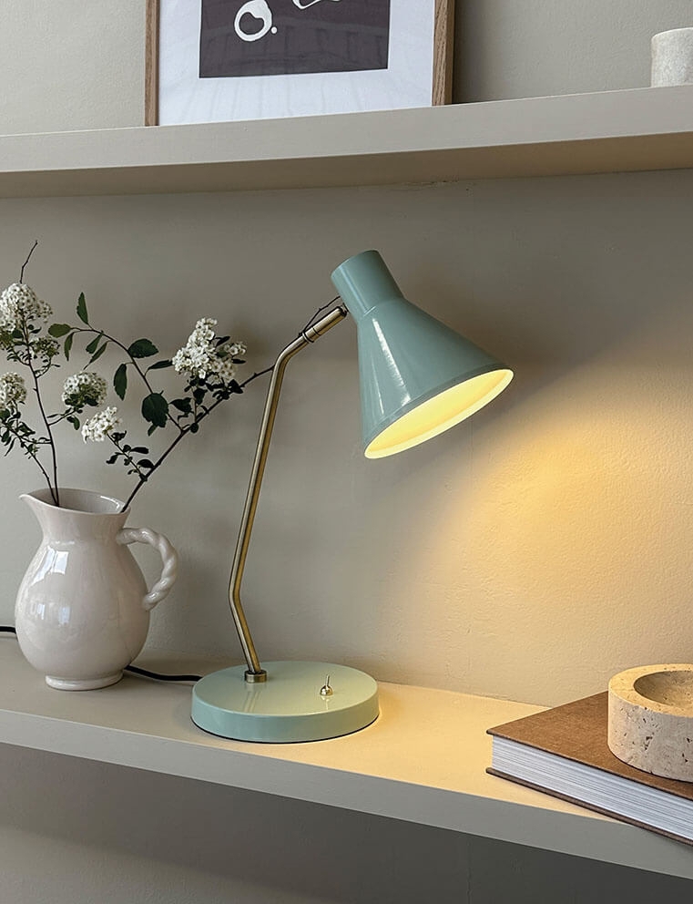Die Sleep Tischlampe ist in den Farben Kit Weiß, Mint und Braun erhältlich. Die Serie umfasst auch Stehlampe, Wandleuchte und Klemmleuchte in denselben Farben.