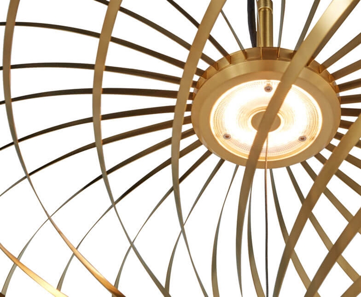 Die Spring Pendelleuchte besteht aus mehreren biegsamen Bändern aus Edelstahl mit Messingfinish, die wie eine Feder in verschiedene Silhouetten von einer ganz flachen Form bis zu einer vollen Kürbisform eingestellt werden können. Die Pendelleuchte bietet ein schönes Zusammenspiel von Licht und Schatten und passt gut in viele Einrichtungsstile. Sie kann beispielsweise über dem Esstisch platziert werden.