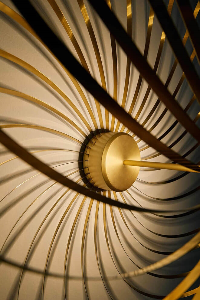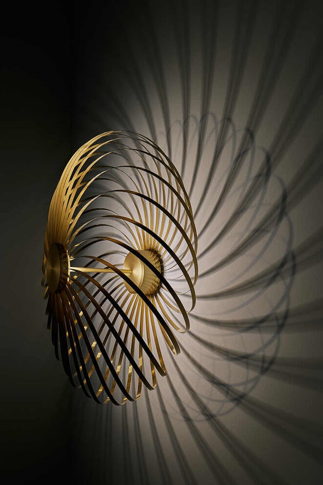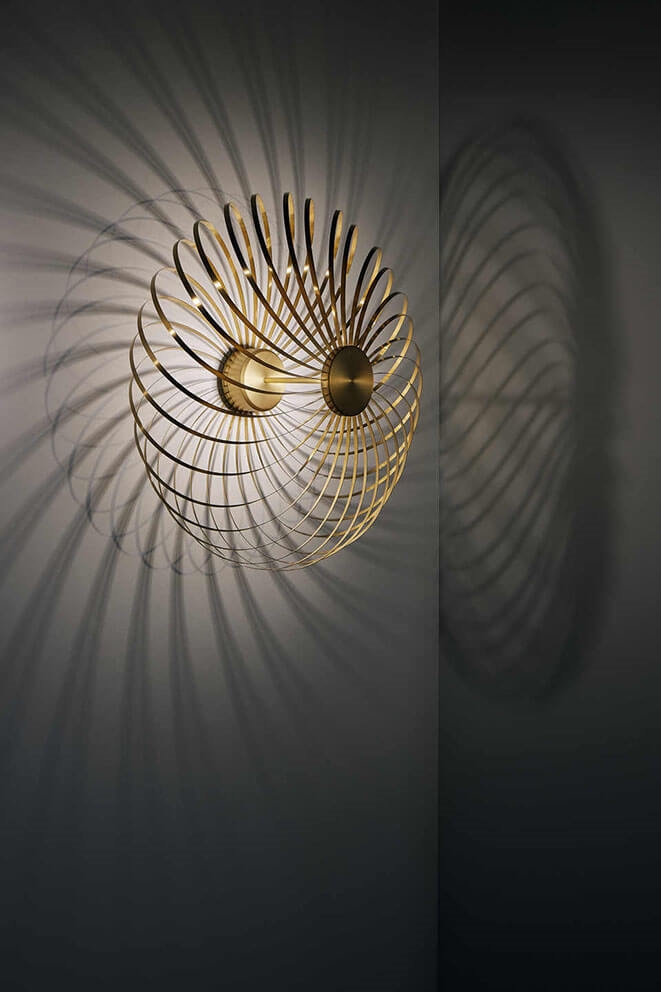 Die Spring Wandleuchte besteht aus mehreren Bändern aus Edelstahl mit Messingfinish, die in der Silhouette einer Feder ähneln. Die Wandleuchte bietet ein schönes Zusammenspiel von Licht und Schatten und passt gut ins Wohnzimmer oder Schlafzimmer und trägt als Designelement zur Einrichtung bei.