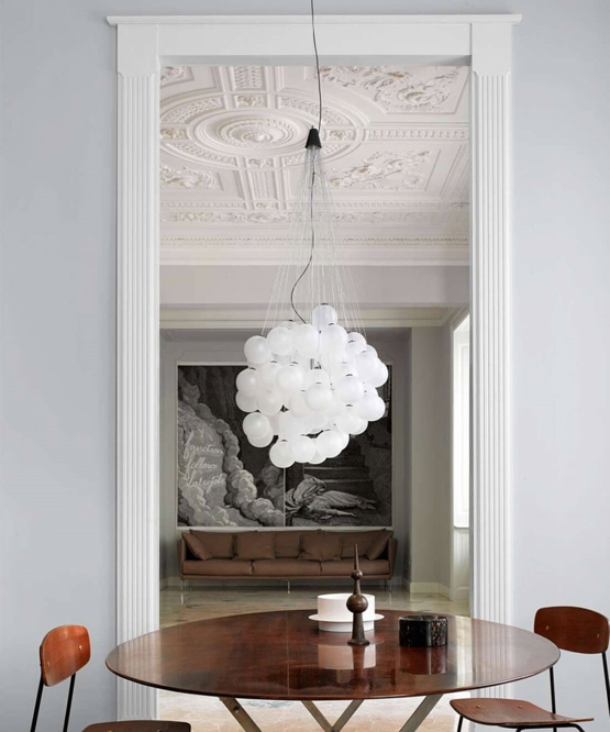 Luceplan Stochastic Pendelleuchte / Kronleuchter 48 Kugeln und Stäbe, opal - entworfen von Daniel Rybakken