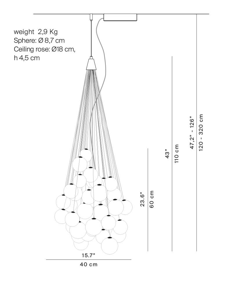Stochastic ist mit entweder 48 oder 72 Glaskugeln erhältlich, die jeweils in unterschiedlichen Höhen hängen, was zu einer fantasievollen und dekorativen Ansammlung führt.