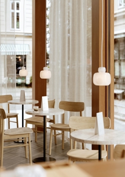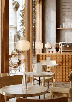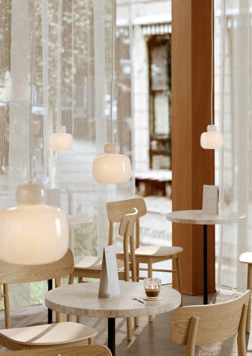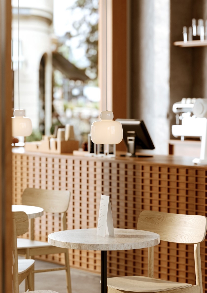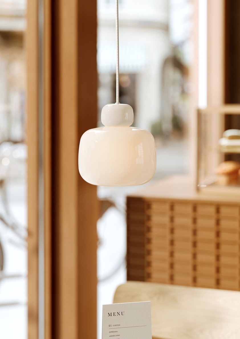 Die milchweiße Stone Pendelleuchte aus Triplex-Opalglas wurde 2026 eingeführt und ist in zwei Größen mit passendem weißem Textilkabel und Baldachin erhältlich.