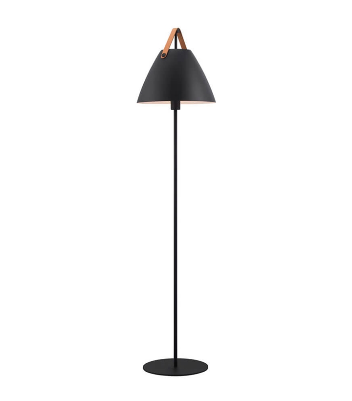 Die Stehlampe Strap kombiniert Metall und Leder im modernen nordischen Stil. Die Strap-Serie verdankt ihren Namen den auffälligen Riemen, die der Lampe Wärme und einen rauen Touch verleihen. Das Design balanciert zwischen einem klassischen und einem industriellen Ausdruck.