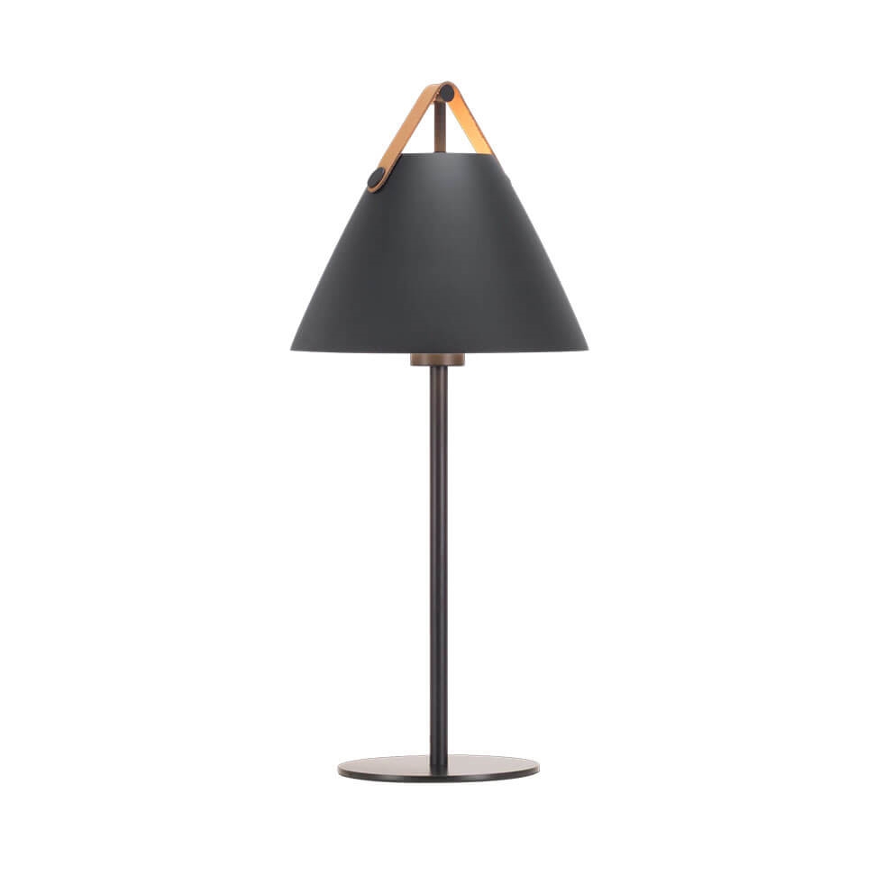 Die Tischleuchte Strap kombiniert Metall und Leder im modernen nordischen Stil. Die Strap-Serie verdankt ihren Namen den auffälligen Riemen, die der Lampe Wärme und einen rauen Touch verleihen. Das Design balanciert zwischen einem klassischen und einem industriellen Ausdruck.