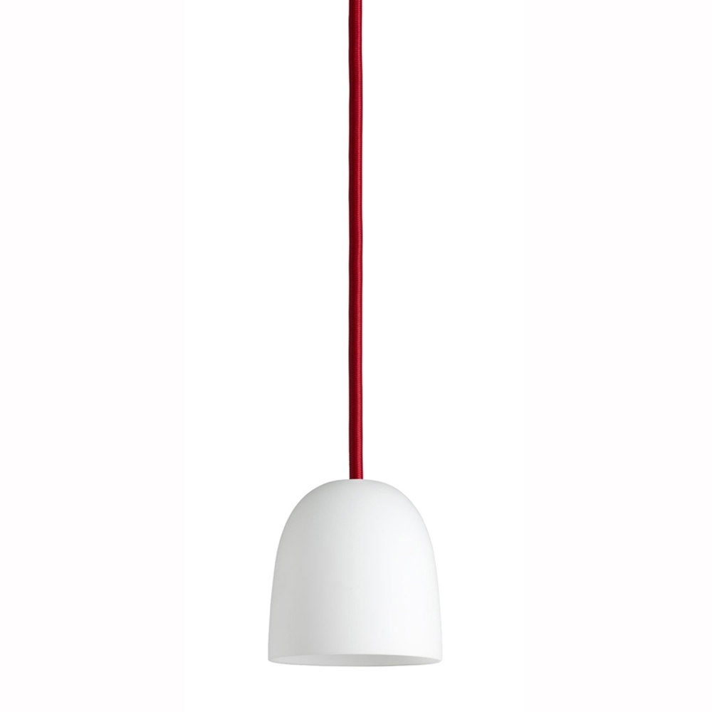 Die Super Pendelleuchte ist in drei verschiedenen Größen in Opal erhältlich (die größte kann auch mit weißer Lackierung gewählt werden) mit weißer, schwarzer oder roter Leitungsfarbe.