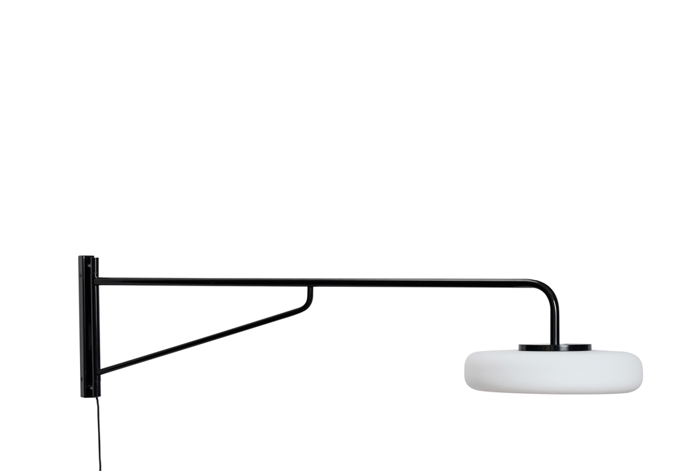 Die Wandleuchte Sway ist ein stilvolles Design, das ein modernes schwarzes Metallgestell mit einem Schirm aus mattweißem Opalglas kombiniert. Die Leuchte spendet ein warmes, angenehmes Licht und passt mit ihrem zeitlosen Stil sowohl zu klassischen als auch zu modernen Einrichtungen.