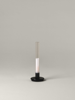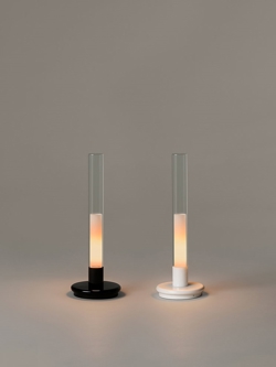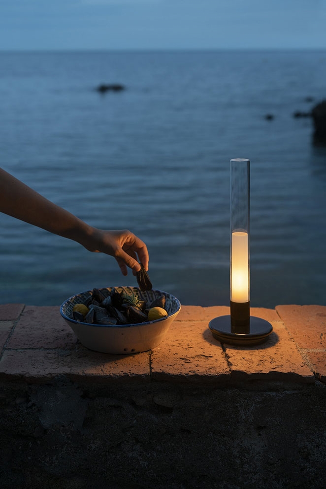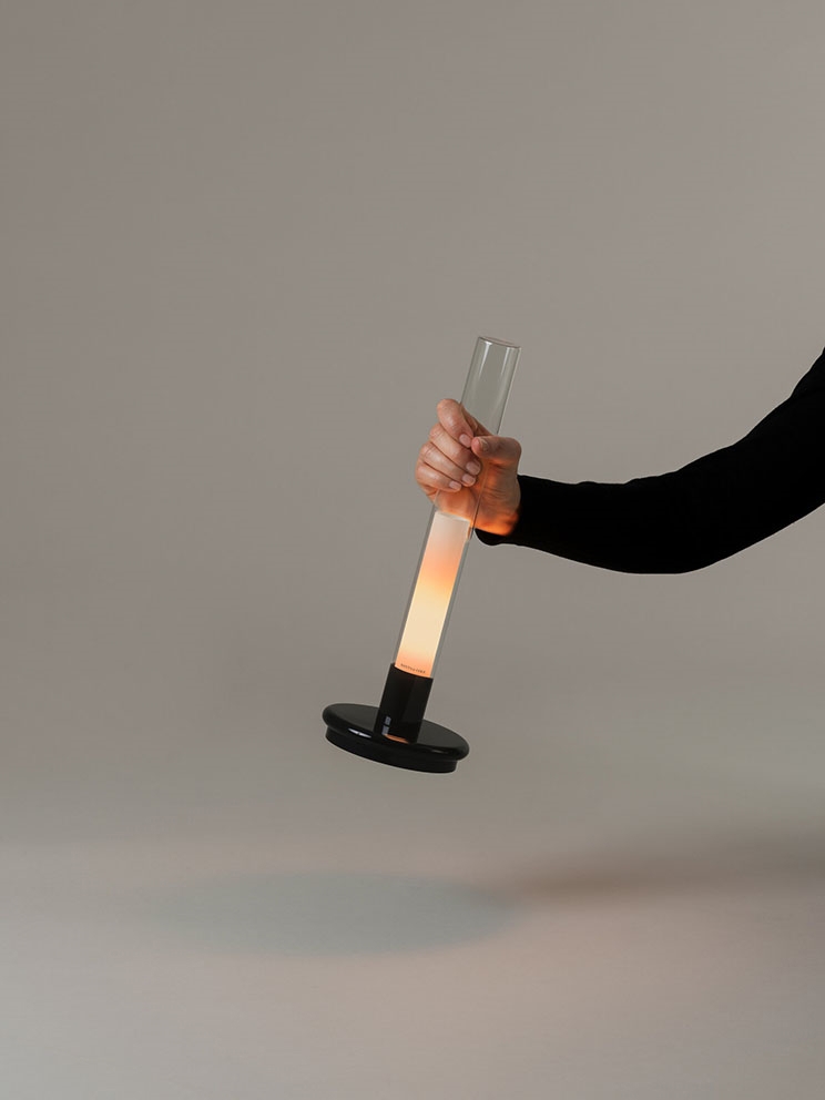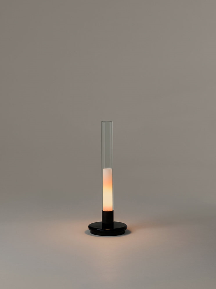 Der Schirm ist aus transparentem Pyrex-Glas gefertigt und der metallische Sockel ist glänzend schwarz. Der Schalter befindet sich an der Lampe, die über 2 Lichtstufen verfügt. Bei höchster Leistung leuchtet sie 7 Stunden und bei niedrigster Leistung 14 Stunden. Eine vollständige Aufladung dauert 5 Stunden.
